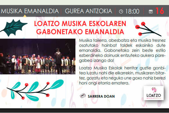 Musika tailerra, abesbatza eta musika tresnez osatutako hainbat taldek eskainiko dute emanaldia. Gabonetako zein beste estilo ezberdineko doinuak entzuteko aukera paregabea izango da! Loatzo Musika Eskolak herritar guztie gonbitea luzatu […]