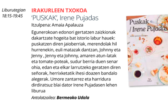 Itxaso Martin Zapirainen (Donostia, 1981) Puntobobo (2024, Erein) liburuaz hitz egingo dute.