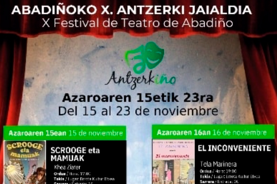 Antzerkiño Antzerki Jaialdiaren 10.e edizioa azaroaren 15etik 23ra egingo da. Azaroaren 15ean hasiko da Antzerkiño, Abadiñoko Antzerki Jaialdia. Abadiñoko Udalak Banarte Antzerki Taldearekin eta Txanporta Kultur Klubarekin elkarlanean antolatzen du […]